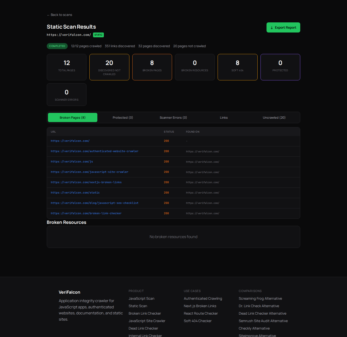 VeriFalcon already distinguishes broken pages, broken resources, soft 404s, protected routes, blocked routes, JS errors, API failures, and scanner errors.